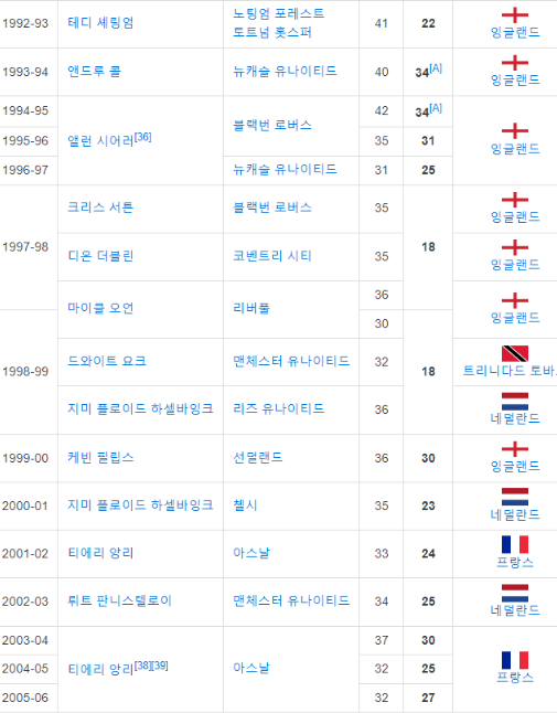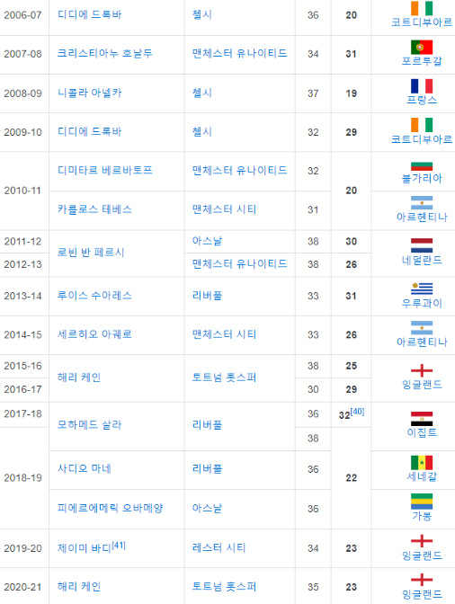 기존 PK 골 없이 득점왕을 차지한 선수로는 베르바토프(20골), 사디오 마네(22골), 루이스 수아레즈(31골)이 있으며 이름만 들어도 대단한 선수들과 어깨를 나란히 하게 됐습니다.